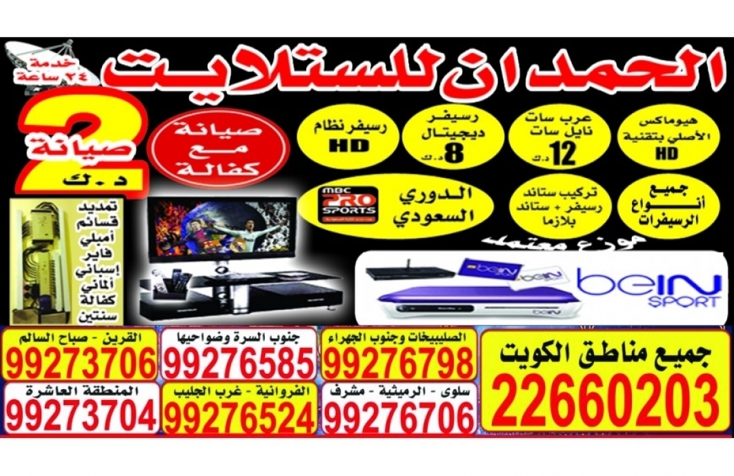 الحمدان للستلايت - هيوماكس الاصلي بتقنيه HD- عرب سات - نايل سات - رسيفر ديجتال - رسيفر نظام - جميع انواع الرسيفرات - تركيب استاند رسيفر - تركيب ستاند بلازما - الدوري السعودي - جميع مناطق الكويت 22660203