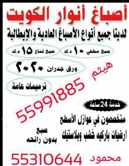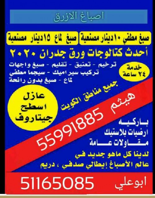 مقولات عامه الكويت جميع انواع الصبغ من الداخل والخارج صبغ مطفي لامع نبرتيه رسم ورق جدران صبغ إيطالي تركيب سيراميك توسعات ملحق صحي كهرباء تركيب وإصلاح مكيفات جميع المقولات