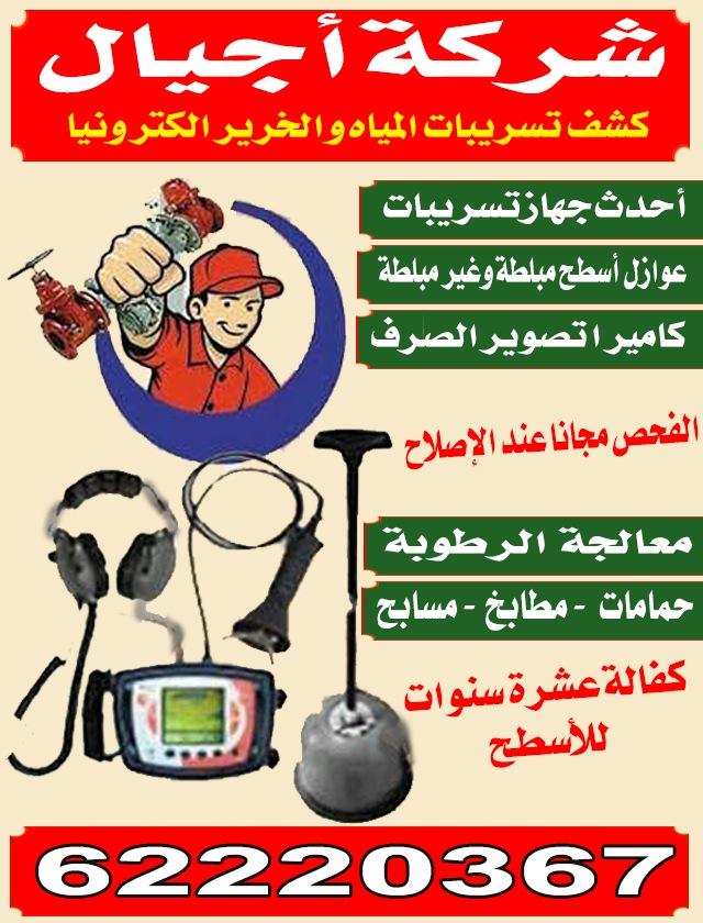 شركة اجيال كشف وتسريبات المياه والخرير الكترونيا -احدث جهاز تسريبات -عوازل اسطح مبطنة -كاميرا تصوير الصرف -الفحص مجانا عندالاصلاح -معالجة الرطوبة حمامات مطابخ مسابح -كفالة 10 سنوات للاسطح الاتصال 62220367