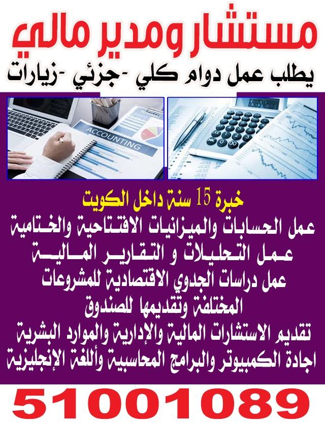 مستشار ومدير مالى يطلب عمل دوام كلى -جزئى -زيارات خبرة 15 سنة داخل الكويت عمل الحسابات والميزانيات الافتتاحية والختاميةعمل دراسات الجدوى الاقتصادية للمشروعات المختلفة اجادة الكمبيوتر والبرامج المحاسبية واللغة الانجليزية الاتصال 51001089