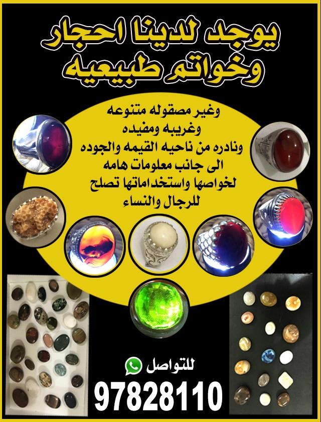 يوجدلدينا احجار وخواتم طبيعية وغير مصقولة متنوعة وغريبة ومفيدة ونادرة من ناحية القيمة والجودة الى جانب معلومات هامة لخواصها واستخداماتها تصلح للرجال والنساء الاتصال 97828110