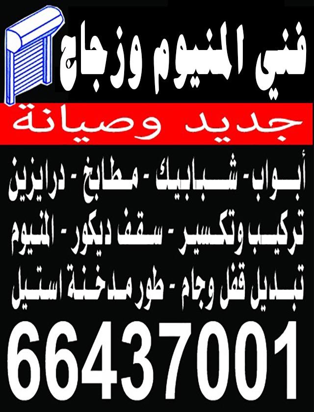 فنى المنيوم وزجاج جديد وصيانة ابواب شبابيك مطابخ درابزين تركيب وتكسير سقف ديكور المنيوم تبديل قفل وجام طور مدخنة استيل 66437001
