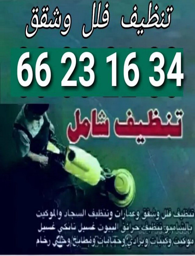 تنظيف فلل وشقق وعمارات ارخص الاسعار ومزترع وقسايم غسيل وتنظيف سجاد وموكيت بالشامبو تنظيف ناشف تنظيف حرائق البيوت غسيل تانكى تنظيف مدارس موكيت كنبات برادى ديوانيات حمامات مطابخ بيت كامل عمارات جلى وتلميع كاشى الاتصال 66231634