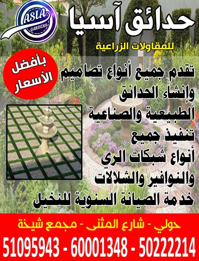 حدائق اسيا 50222214 تنسيق حدائق 50222214 تركيب بلاط متداخل عمل شرائح للبلاط المتداخل انشاء شبكات رى عادى واوتماتيك زراعة التيل الطبيعى والصناعى انشاء حدائق من البداية زراعة وتوريد جميع انواع النخيل الاتصال 50222214